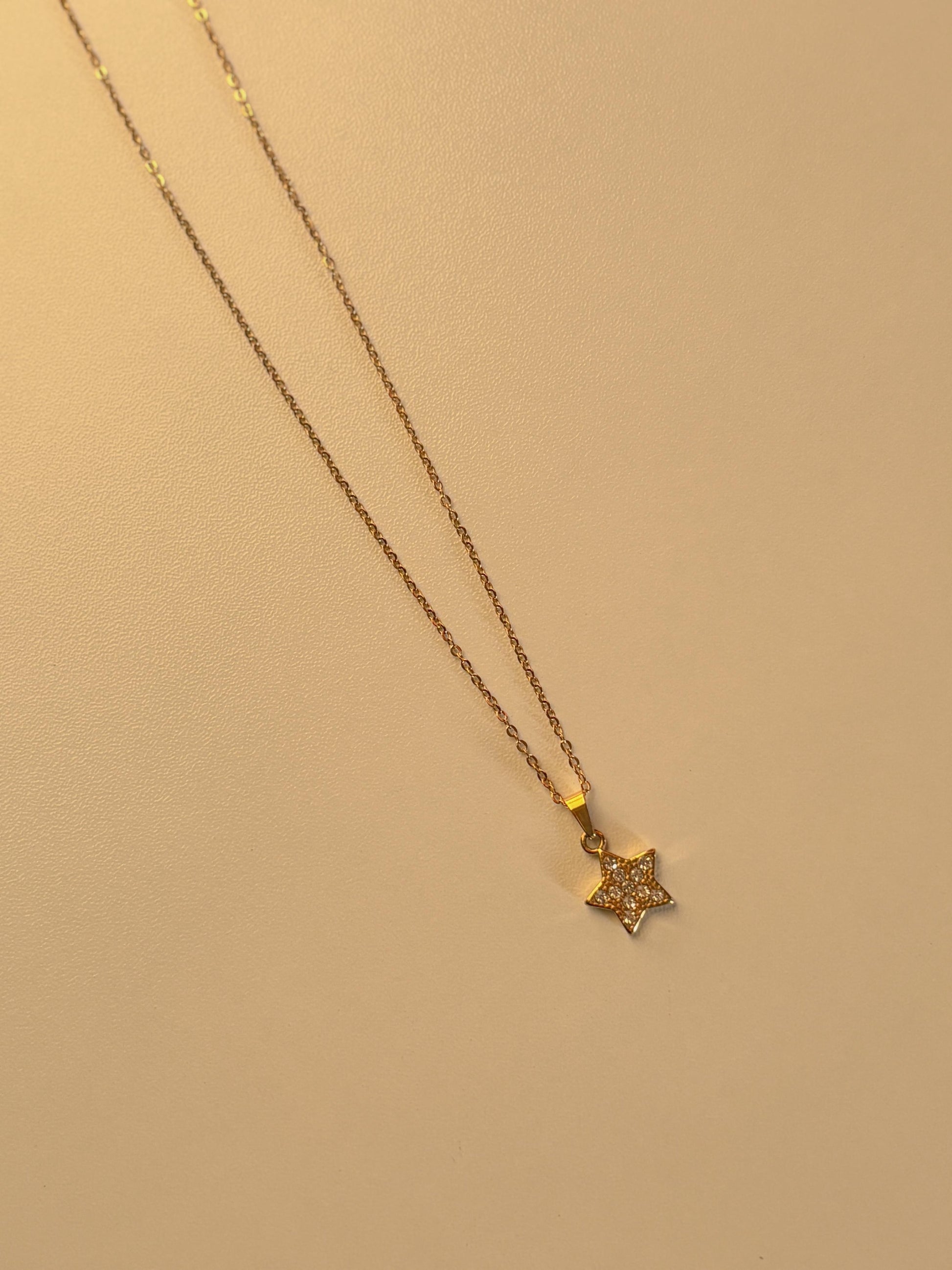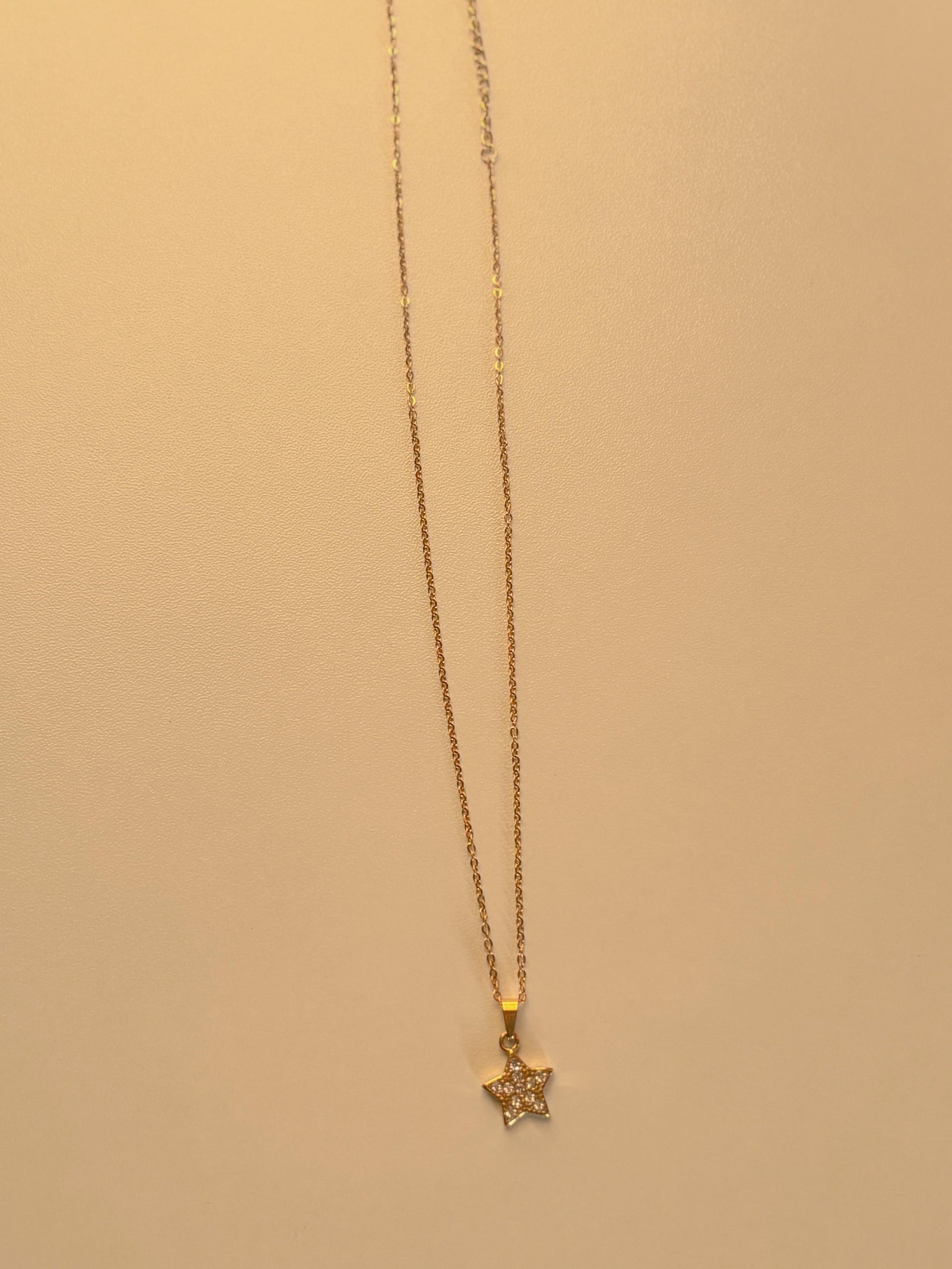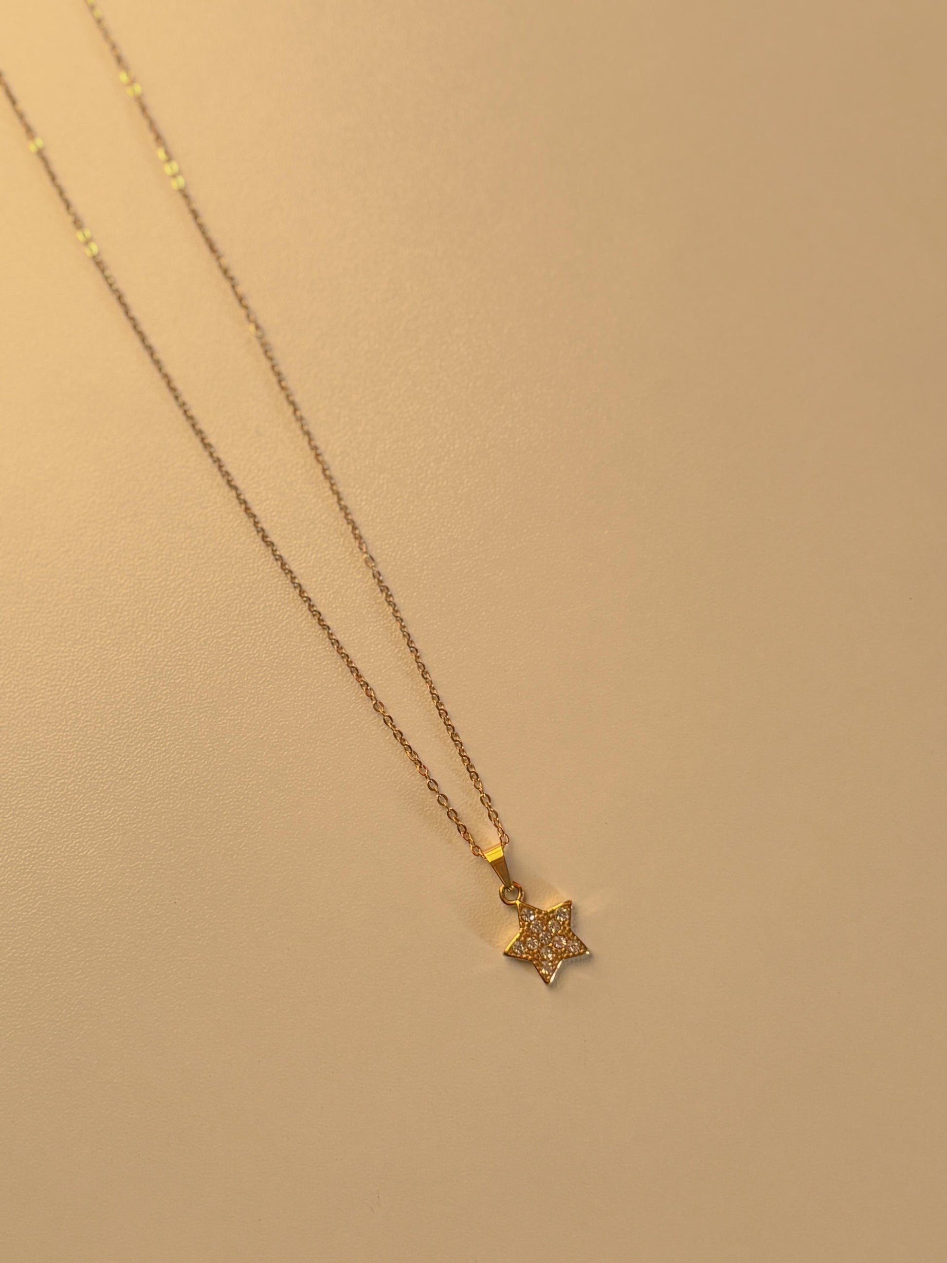 A delicate gold chain featuring a sparkling star-shaped pendant adorned with shimmering crystals. This elegant piece adds a touch of celestial charm and sophistication, perfect for everyday wear or special occasions. Its minimalist yet radiant design makes it an ideal gift for someone who loves timeless and graceful jewelry.