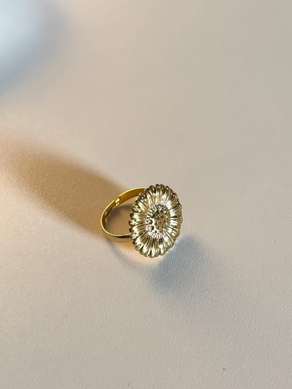 A beautifully crafted adjustable ring featuring a radiant sunflower design in polished gold tone. The intricate detailing of the petals and textured center captures light elegantly, making it a perfect statement piece for any outfit. Ideal for those who love nature-inspired jewelry with a touch of vintage charm.