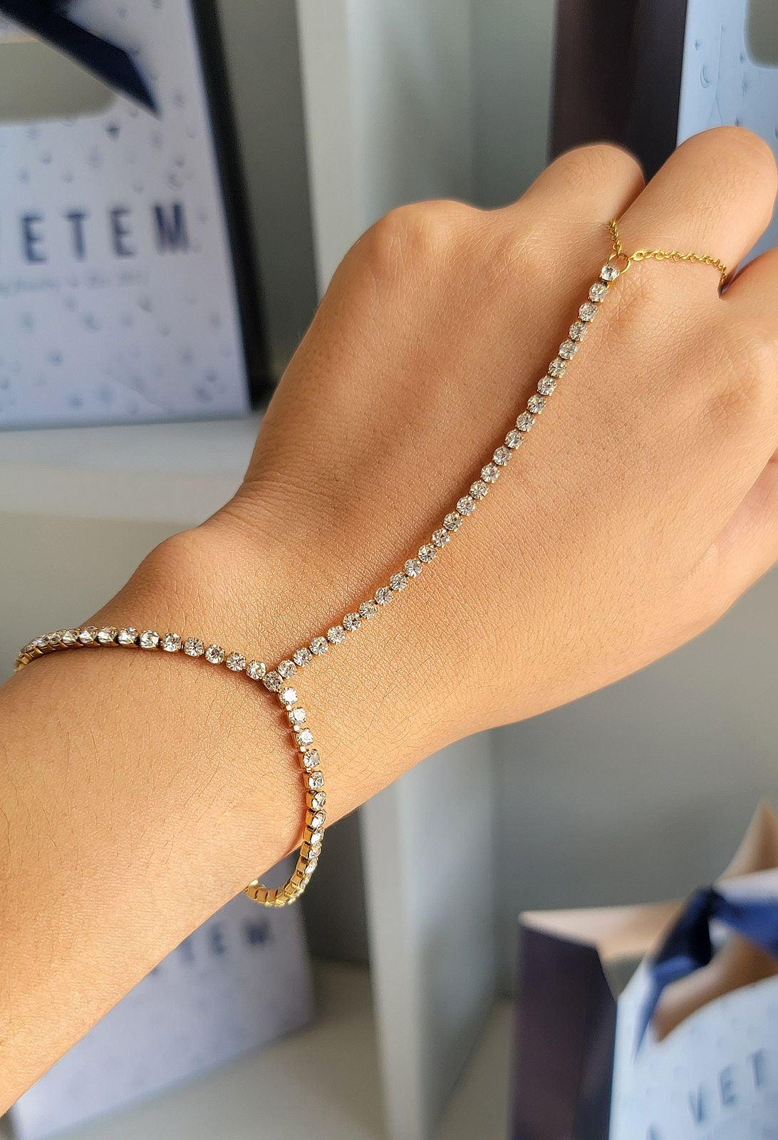 The Noor Hand Halo is designed for the girls who love subtle glam. With its fine crystal-lined chain connecting the bracelet to the ring, it gives that royal touch without feeling heavy.